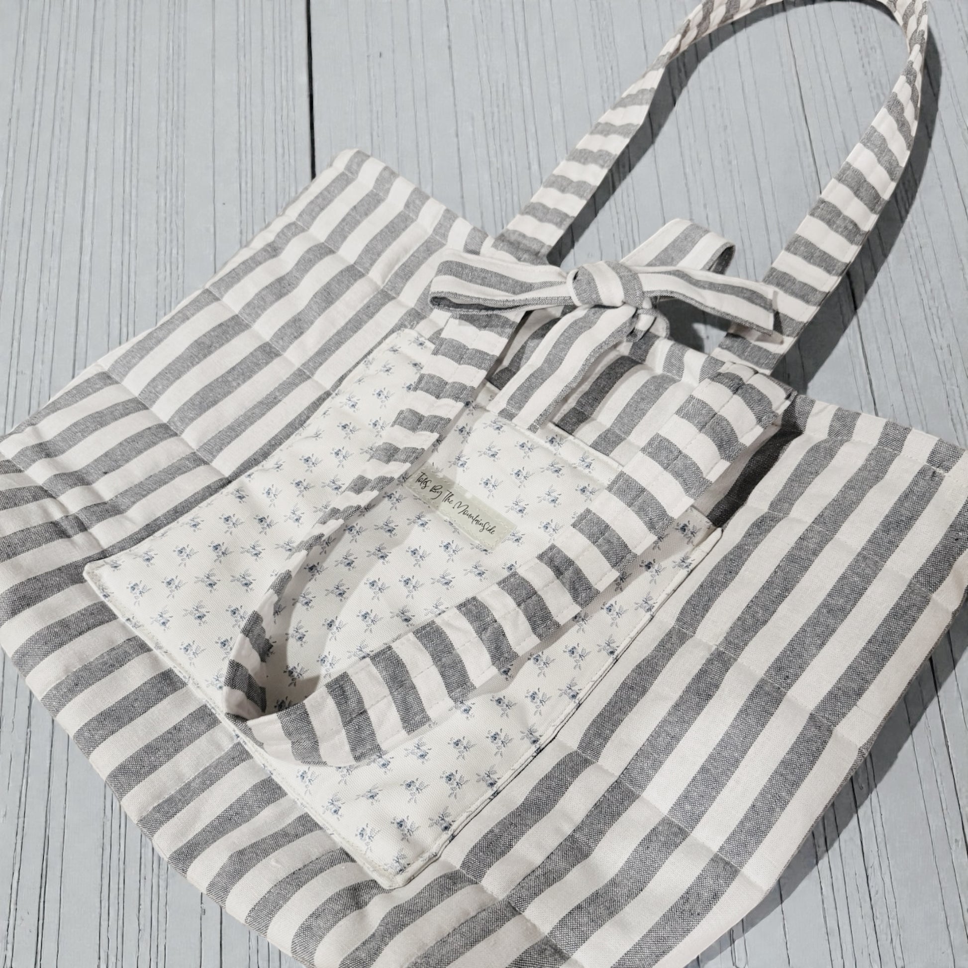 This tote bag features a quilted design with light blue and white stripes and a front pocket with a floral pattern of small blue flowers. It has two striped handles and is labeled "Totes By The Mountainside."