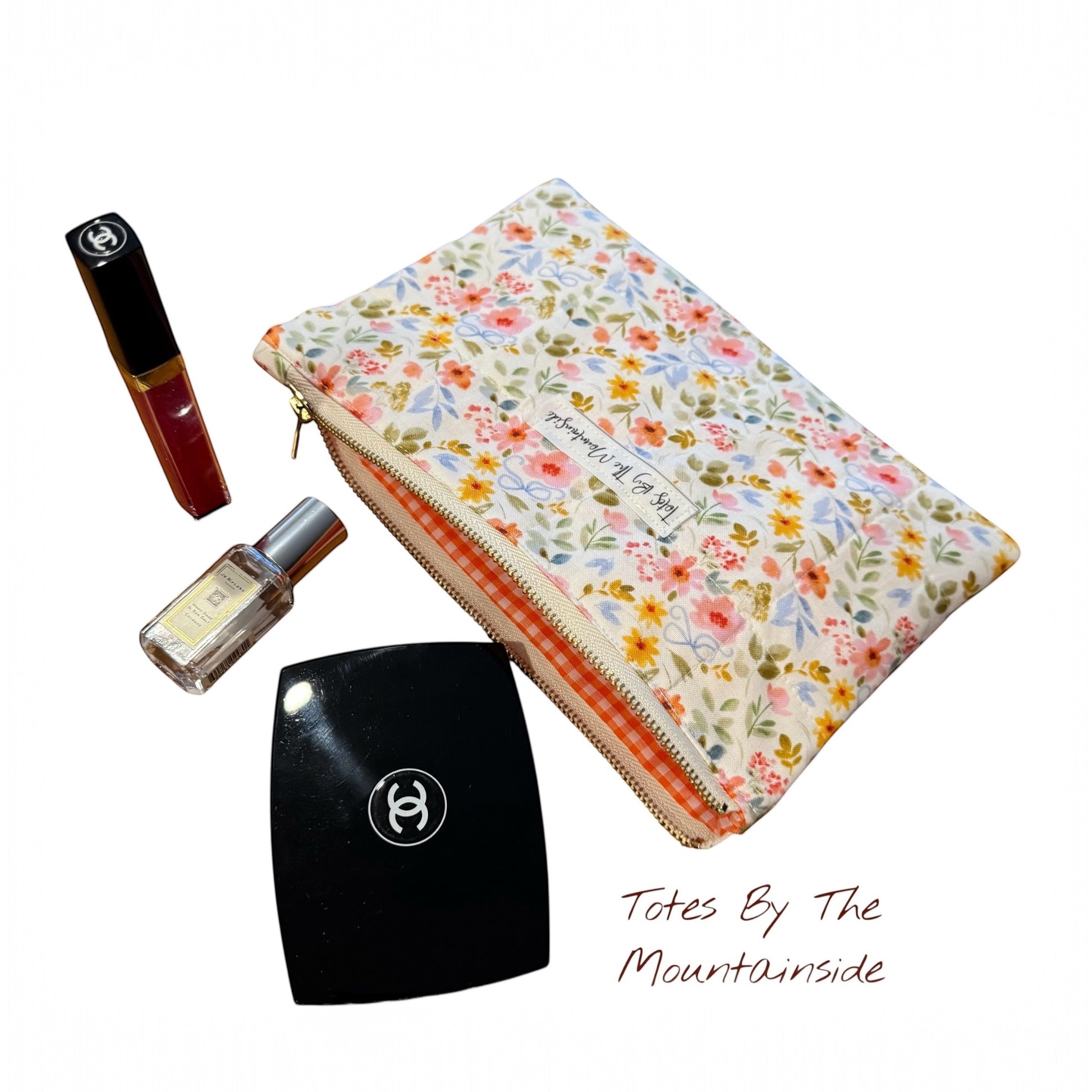 Wallet: Made from the same gorgeous fabric with a secure zipper, featuring a classic orange gingham pattern. Spacious enough for beauty products, money, coins, cards, and keys. Free with the tote bag!