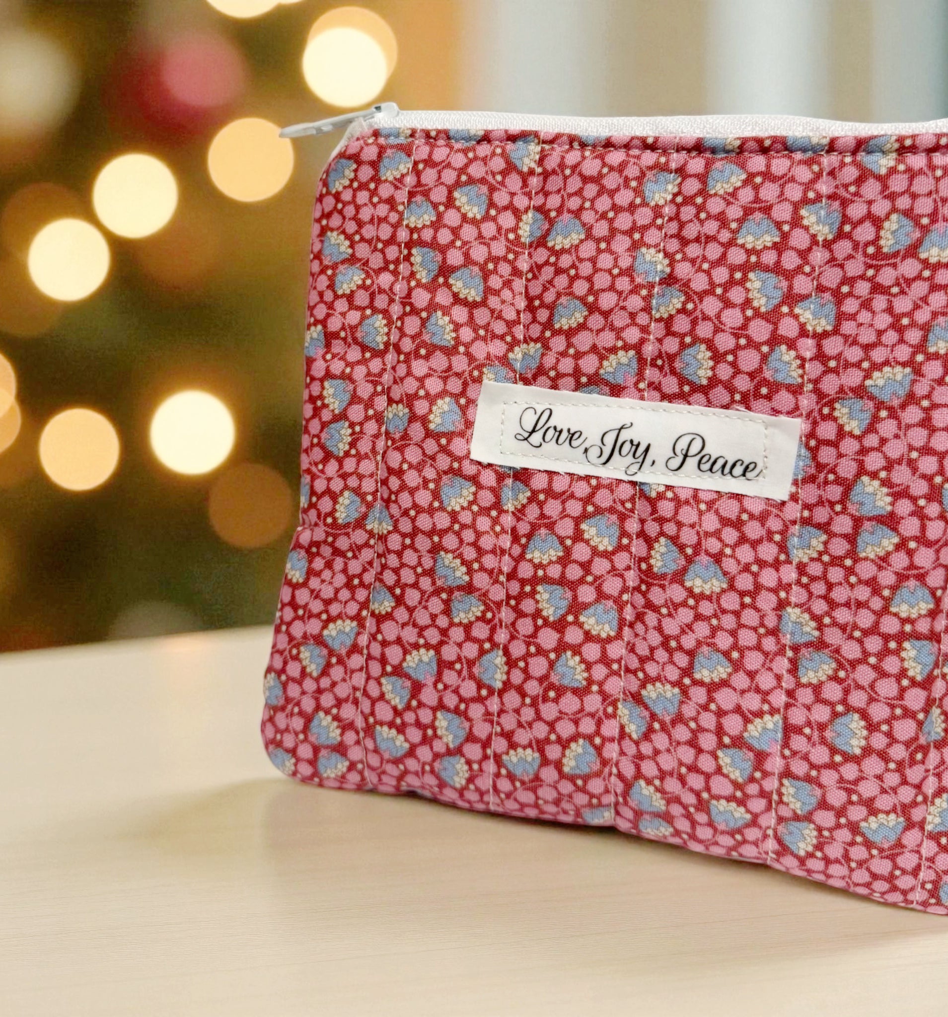 On the pouch's front, a white label is elegantly scripted with the words "Love, Joy, Peace," conveying a warm and positive message.